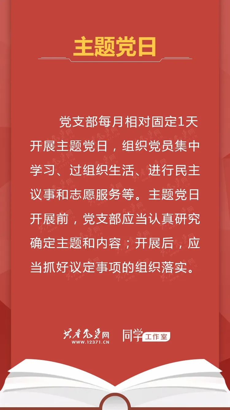 党支部每月相对固定1天开展主题党日,组织党员集中学习、过组织生活、进行民主议事和志愿服务等。主题党日开展前,党支部应当认真研究确定主题和内容;开展后,应当抓好议定事项的组织落实。