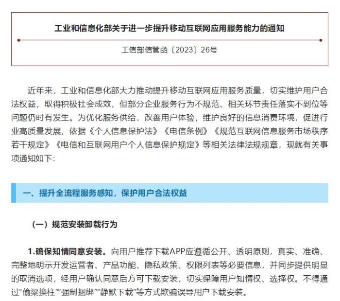 2月27日,《工业和信息化部关于进一步提升移动互联网应用服务能力的通知》(以下简称《通知》)对外发布。文件明确提出26条措施,对上述乱象进行了规范。从APP上架到下架、从安装到卸载、从使用到投诉,覆盖用户使用APP过程中的整个链条。