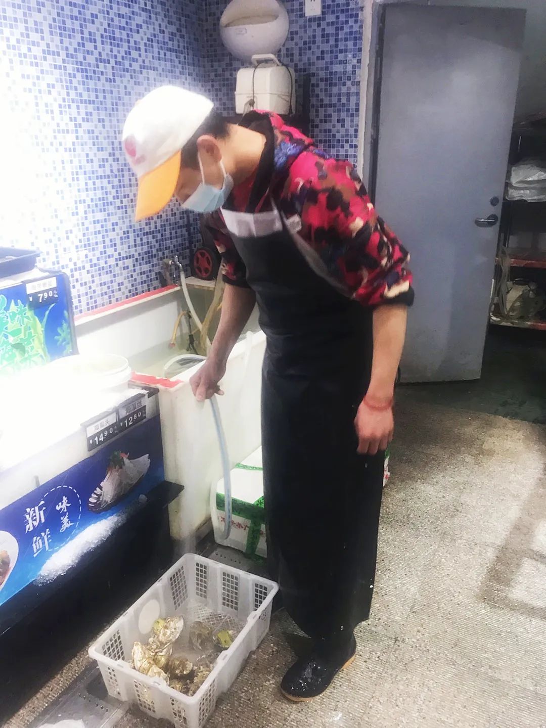虽说来水产组只有半年时间,但上手很快,一学就会。完全看不出来只做半年的时间,俨然像个老师傅。入职第二天就能独当一面,一个人上中班,既能杀鱼又能打称,把所有的活儿都干得漂漂亮亮。