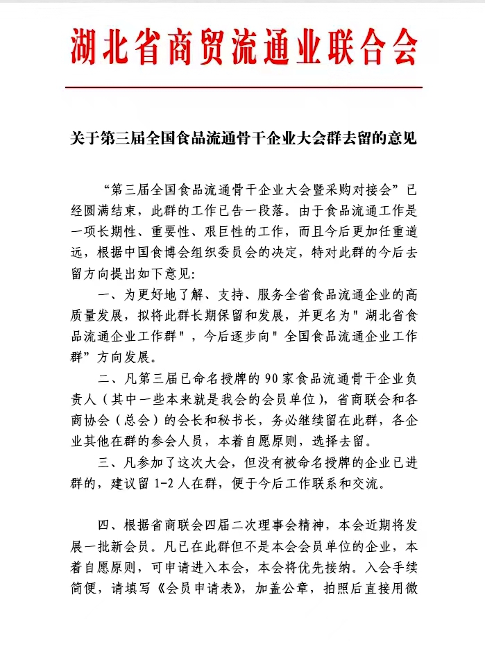 现将省商联会《关于第三届全国食品流通骨干企业大会群去留的意见》《章程》《会员申请表》《简介》《实施“八大创新” 推动行业发展 ——发展势头良好》一并发大家分享!